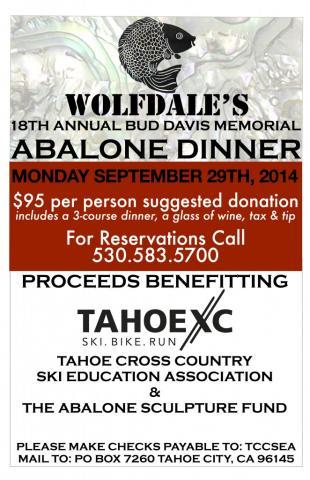 Tahoe Country XC Ski Education Association Fundraiser at Wolfdales is one of the most important fundraisers of the year. Proceeds benefit Tahoe XC Ski Education Association & Abalone Sculpture fund. Dinner includes a 3-course dinner, glass of wine, tax and tip. For reservations call (530) 583-5700.